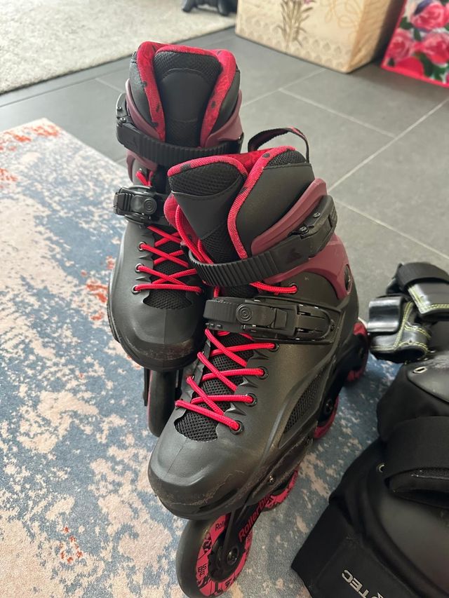 Patines Rollerblade en línea, talla 39, casi nuevos. Ideales para principiantes o uso ocasional. - Color negro y burdeos. - Incluyen dos patines y accesorios.