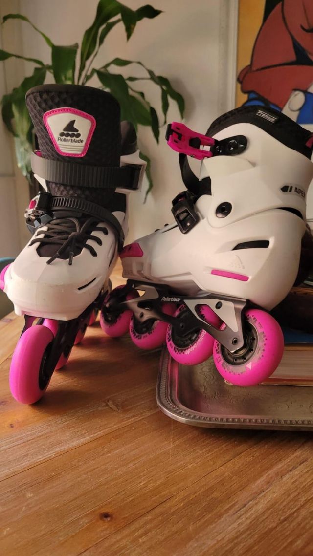 Patines en línea Rollerblade para niña, ajustables en talla. - Ruedas de color rosa. - Cierre de velcro y hebilla. - Bota acolchada para mayor comodidad.