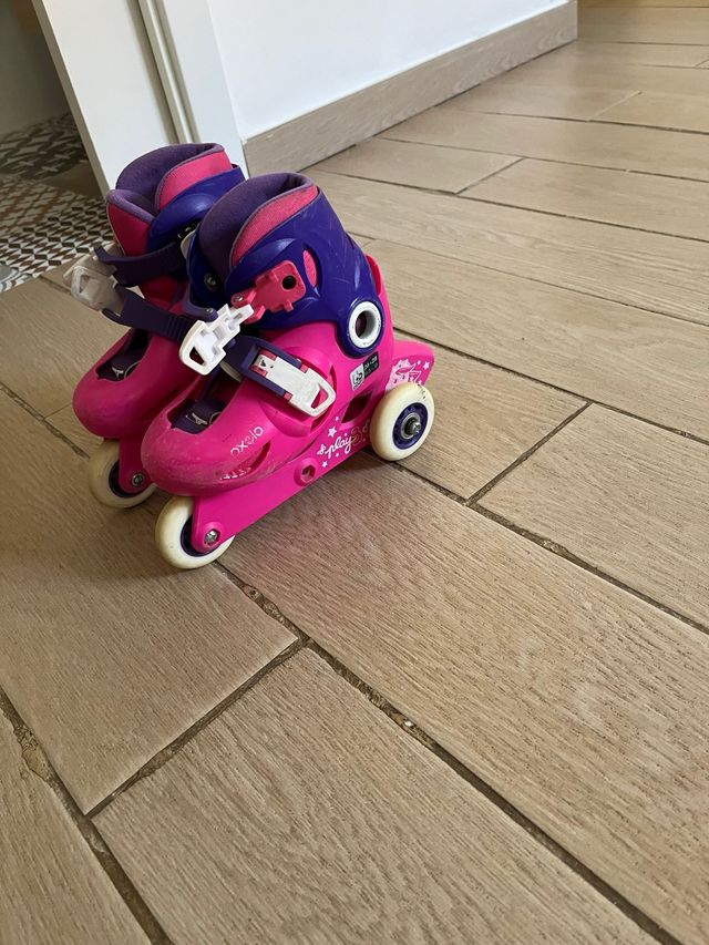 Patines en línea de color rosa y morado. talla 28-30 - Marca Oxelo. - Cierre con hebilla y velcro. - Ruedas blancas con detalles morados.