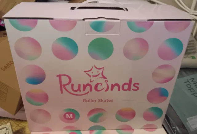 Caja de patines Runcinds. - Talla M. - Diseño con círculos degradados en tonos pastel. - Incluye asa para transporte. Patín con luces. Número 27 al 31.