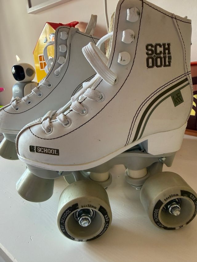 Patines de la marca School en color blanco. Diseñados para patinaje. - Diseño alto tipo bota. - Cordones blancos. - Ruedas de 54x32mm.