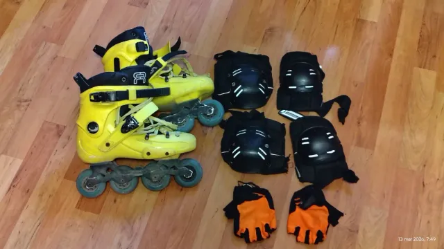 Detalles del productoSe venden patines en línea SEBA FR de color amarillo, junto con un juego completo de protecciones.