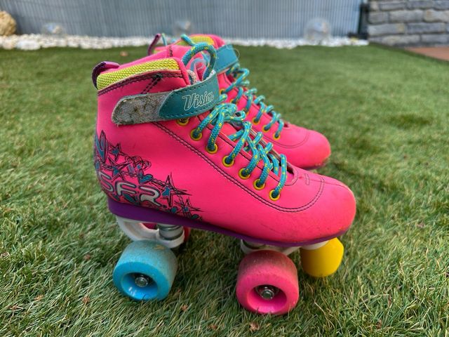 Detalles del productoPatines de cuatro ruedas en color rosa vibrante con detalles en verde y azul.