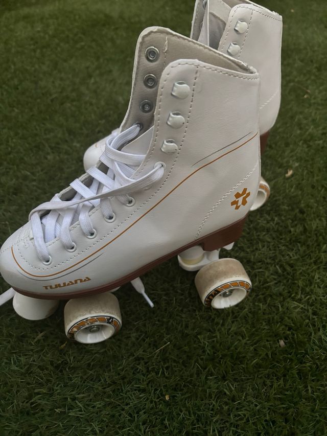 Detalles del productoPatines artísticos Tijuana, talla 36. Son de color blanco con detalles dorados. Ideales para principiantes.
