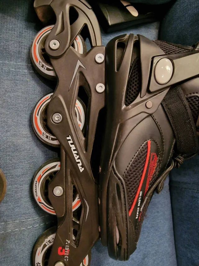 Patines en línea marca Tijuana, talla ajustable de 37 a 40. - Diseño en color negro con detalles en rojo. - Ruedas de poliuretano (PU). - Cierre de velcro y cordones.