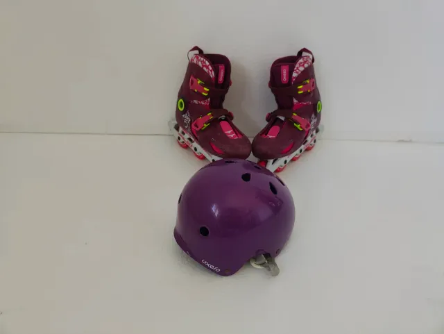 Set de patines y casco para niños. - Patines ajustables en color morado con detalles en rosa y amarillo. - Casco protector morado con ventilación.
