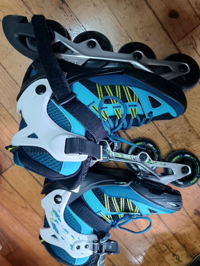 Detalles del productoPatines nuevos en linea, usados una vez. Talla 38 a 41. Protecciones de codos, muñecas, rodillas y casco. Y además otras más que tenía de antes. Total 2 juegos completos de protecciones.