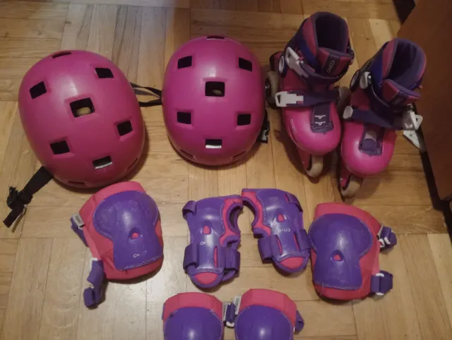 Detalles del productoConjunto de patines y protecciones para niños en colores rosa y morado. Incluye patines ajustables.