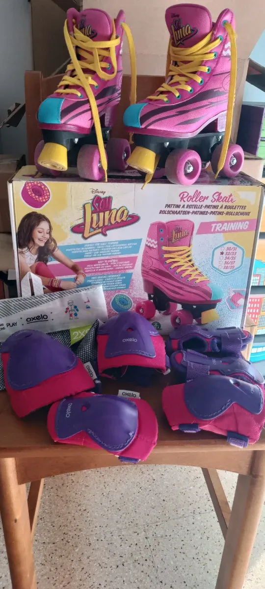 Detalles del productoSet de patines de la serie Yo Soy Luna en color rosa y amarillo, talla 32/33. Incluye protecciones para rodillas y codos.