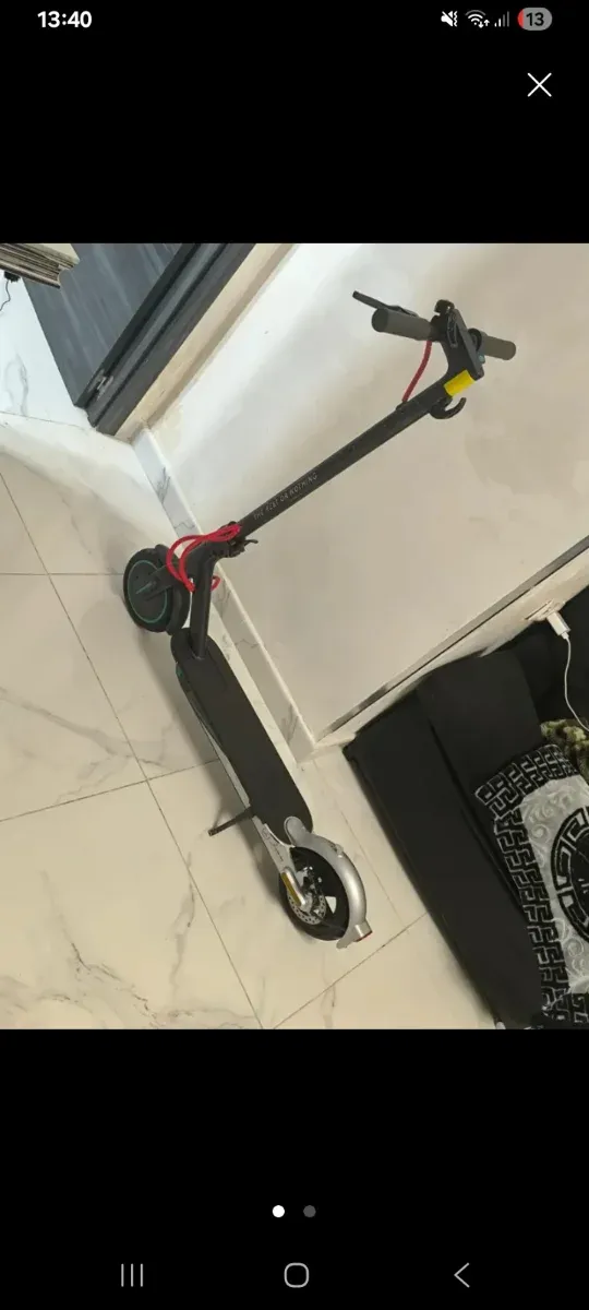 Patineta eléctrica de color negro, con detalles en rojo y amarillo. - Diseño moderno y elegante. - Ruedas plateadas. - Manillar plegable.