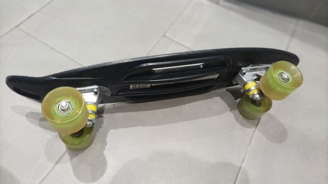 Patinete negro con cuatro ruedas. - Ruedas de color translúcido. - Ejes metálicos.