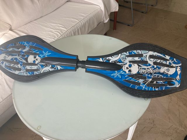 Detalles del productoPatineta tipo waveboard con diseño de calaveras y llamas en tonos azules y blancos. Ideal para deslizarse y realizar trucos.