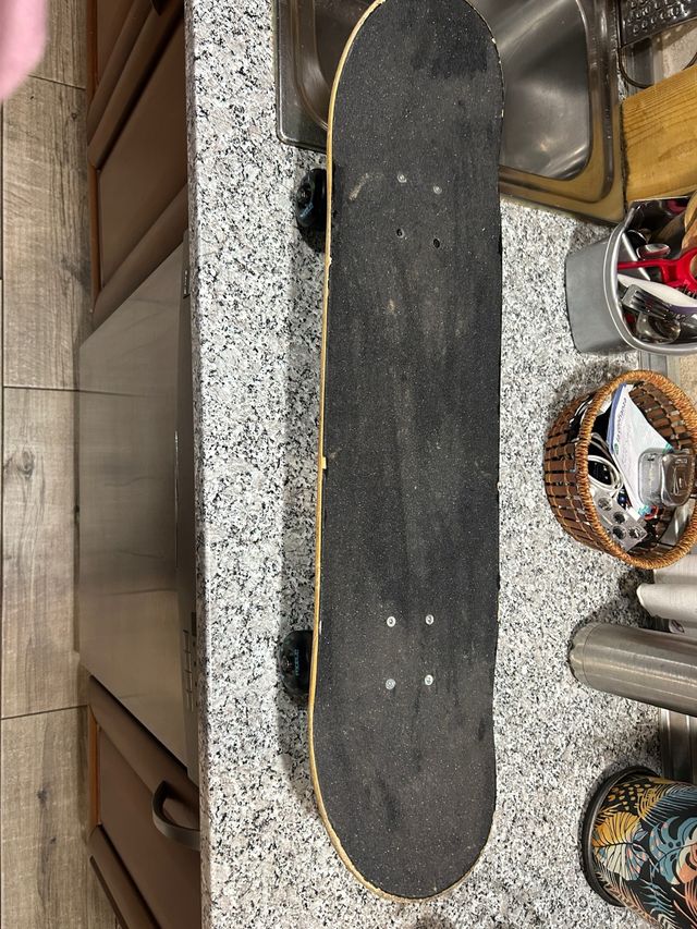 Patinete con cubierta negra y detalles de madera. - Cubierta de lija negra. - Ruedas negras.