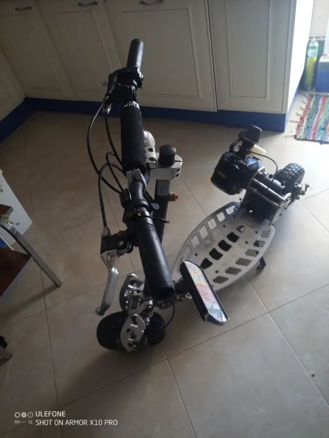 Patinete de gasolina con motor de 2 tiempos. - Chasis metálico. - Ruedas todoterreno. - Manillar ajustable.