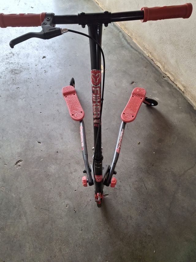 Patinete de tres ruedas con manillar ajustable y freno. - Manillar con empuñaduras rojas. - Plataformas para los pies en color rojo. - Ruedas delanteras dobles.