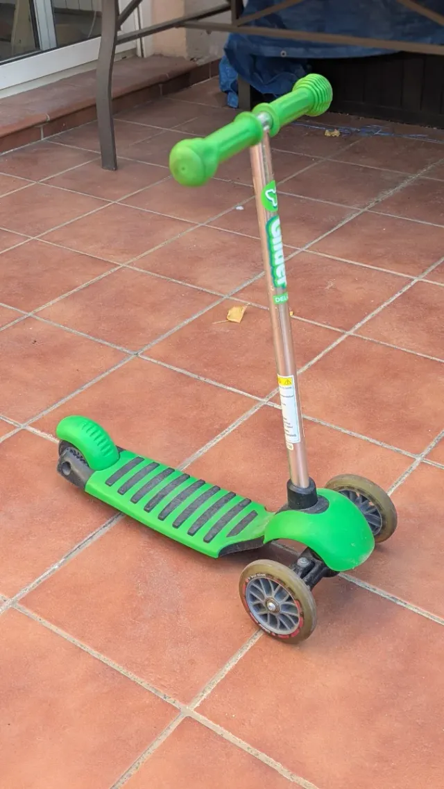 Patinete de tres ruedas en color verde, ideal hasta los 4 años. Altura del manillar 68cm. En perfecto estado.