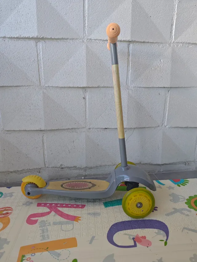 Patinete de tres ruedas en colores gris y amarillo. - Ruedas delanteras amarillas. - Plataforma con diseño. - Manillar ajustable.