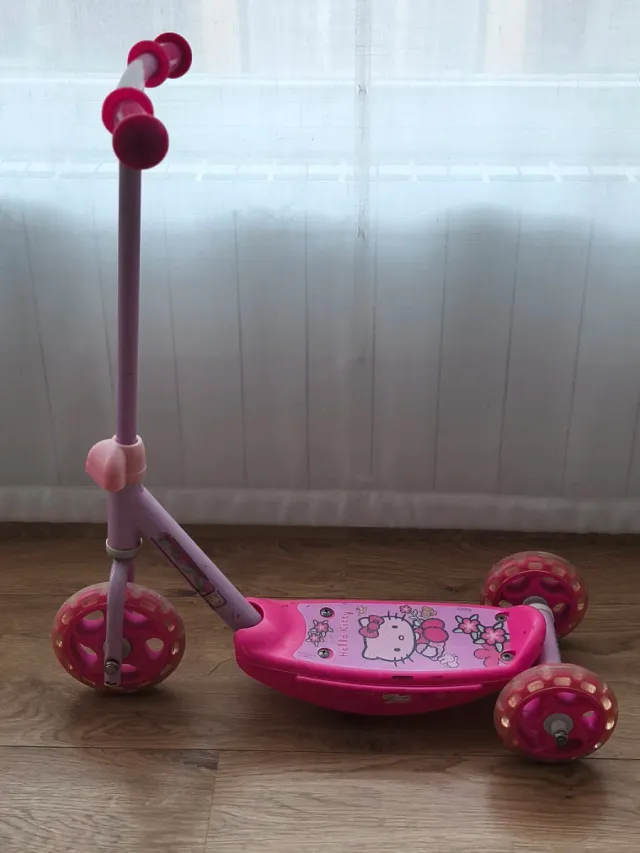 Detalles del productoPatinete infantil de tres ruedas con diseño de Hello Kitty.
