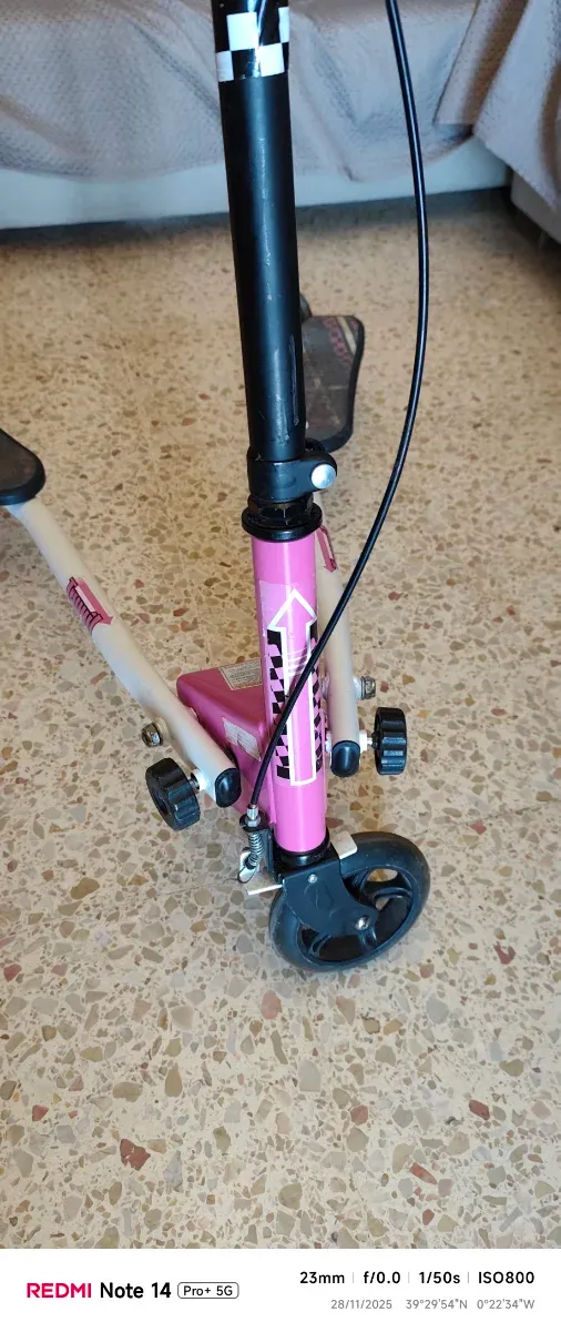 Patinete de tres ruedas con un llamativo diseño en color rosa y detalles en blanco y negro. - Manillar ajustable. - Ruedas de goma. - Freno trasero.