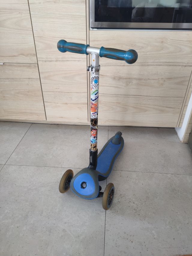 Detalles del productoPatinete infantil de tres ruedas, ideal para niños. Está en buen estado, con algunas pegatinas en el manillar.