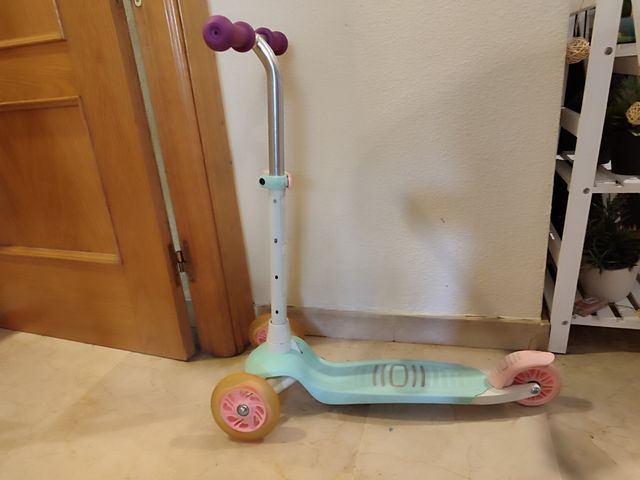 Detalles del productoPatinete de tres ruedas de la marca Oxelo, de Decathlon. Con luces en las ruedas. Ideal para +3 años