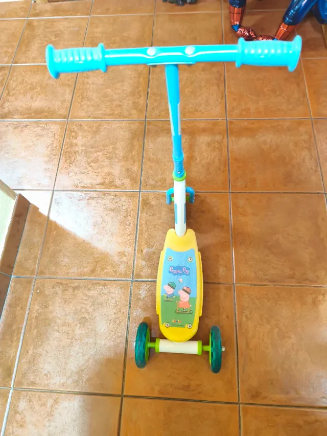 Patinete de tres ruedas con diseño de Peppa Pig. Tiene un desperfecto en la barra (foto) - Manillar azul. - Plataforma amarilla. - Ruedas verdes.