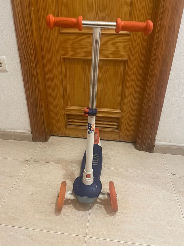 Patinete de tres ruedas en buen estado, con muy poco uso. - Manillar ajustable en altura. - Ruedas de color naranja. - Base antideslizante.