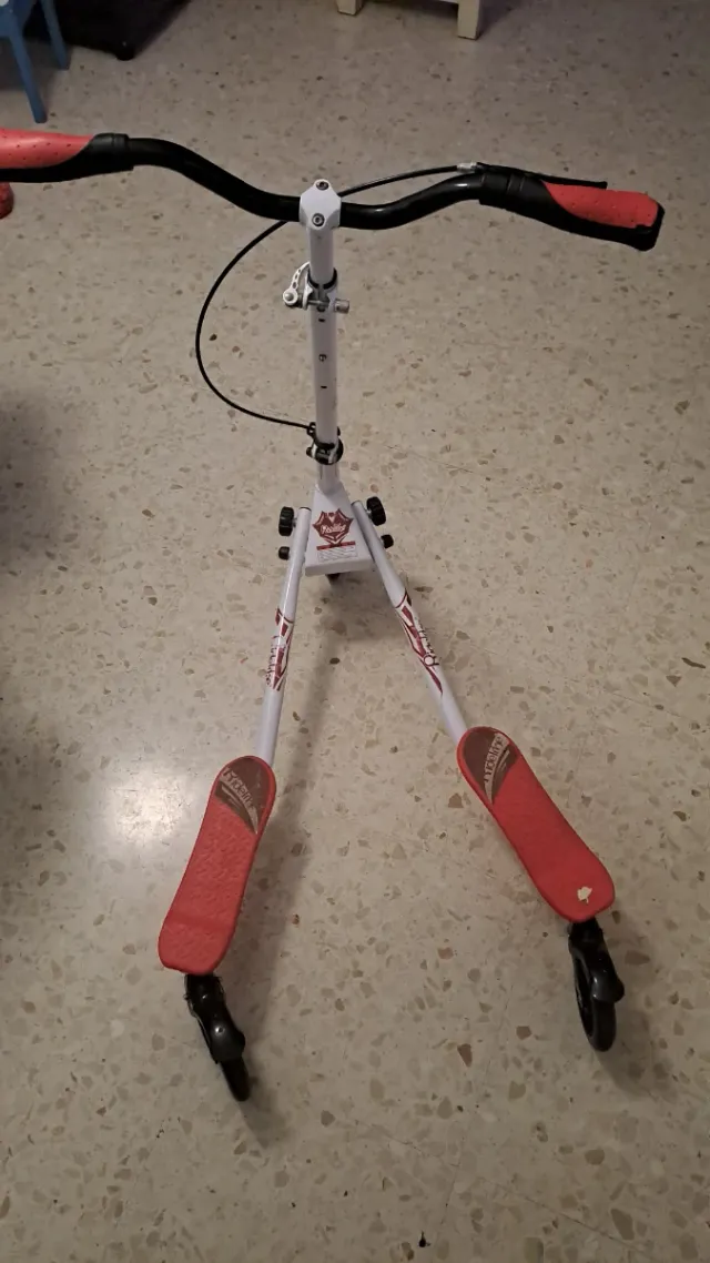 Patinete de tres ruedas con manillar ajustable y frenos. - Color blanco y rojo. - Plataformas antideslizantes. - Ruedas negras.