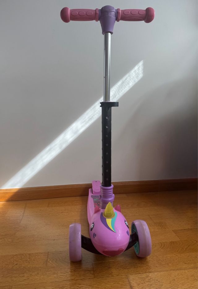 Detalles del productoPatinete infantil de tres ruedas con diseño de unicornio.