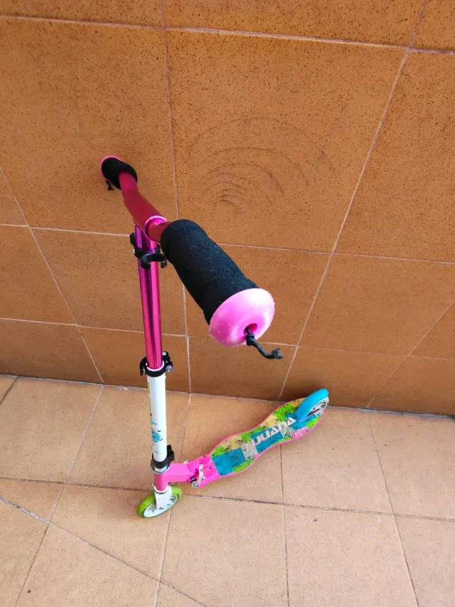 Patinete de aluminio con diseño divertido y colorido. - Manillar ajustable. - Puños de goma para mejor agarre. - Plataforma antideslizante. - Plegable