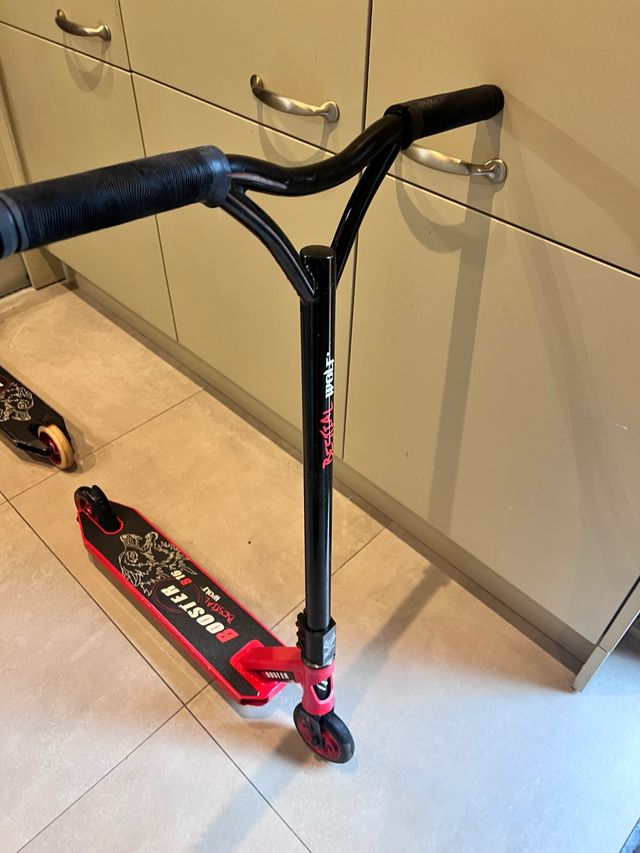 Patinete de la marca Bestial Wolf. - Diseño en color negro y rojo. - Plataforma con detalles gráficos. - Ruedas de color rojo aluminio y negro.