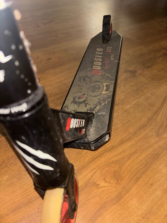 Patinete de la marca Bestial Wolf, modelo B12. - Diseño con gráfico de lobo. - Plataforma con el logo 'BOOSTER'. - Ruedas de color rojo y beige.