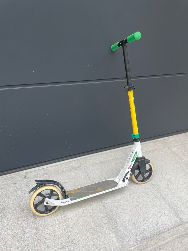 Patinete de dos ruedas con manillar ajustable. - Puños de color verde. - Ruedas de color beige. - Plataforma blanca con detalles gráficos de brazil.
