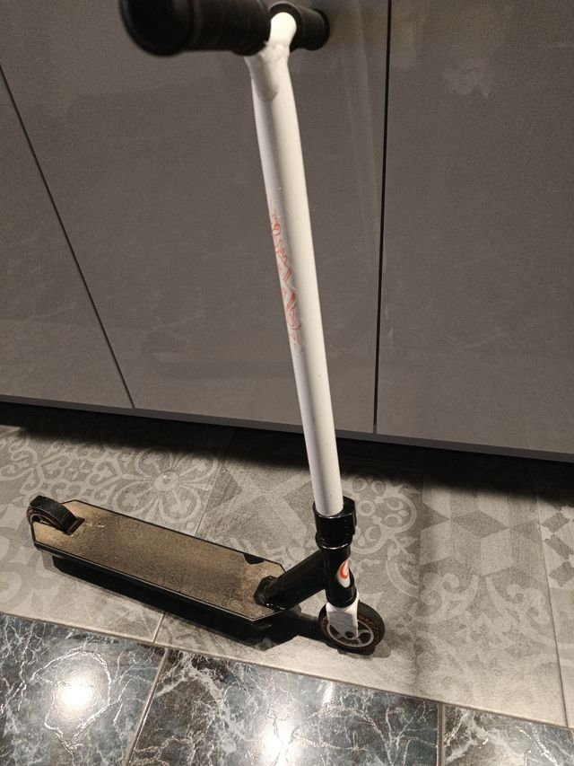 Patinete de estilo urbano con manillar blanco y base negra. - Manillar con puños negros. - Base con diseño texturizado. - Ruedas pequeñas.