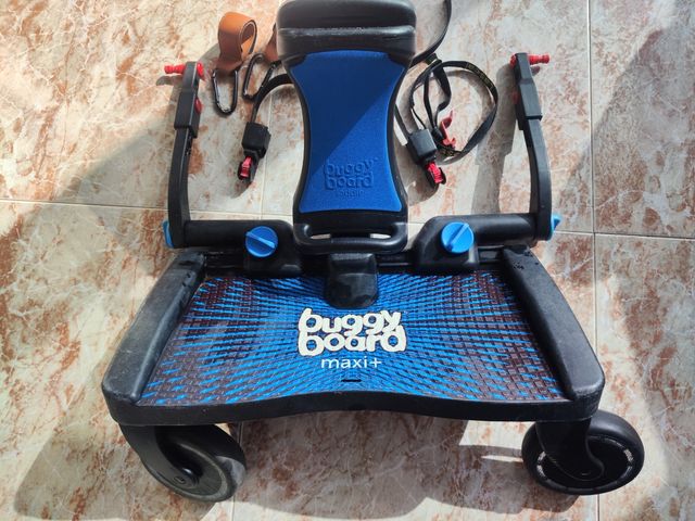 Patinete para silla de paseo Buggy Board maxi+. - Color azul y negro. - Con asiento. - Ruedas incluidas. - tiene todas las accesorios