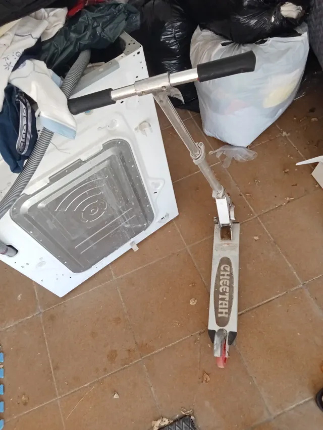 Patinete plegable de la marca CHEETAH. - Diseño plateado y negro. - Ruedas rojas.