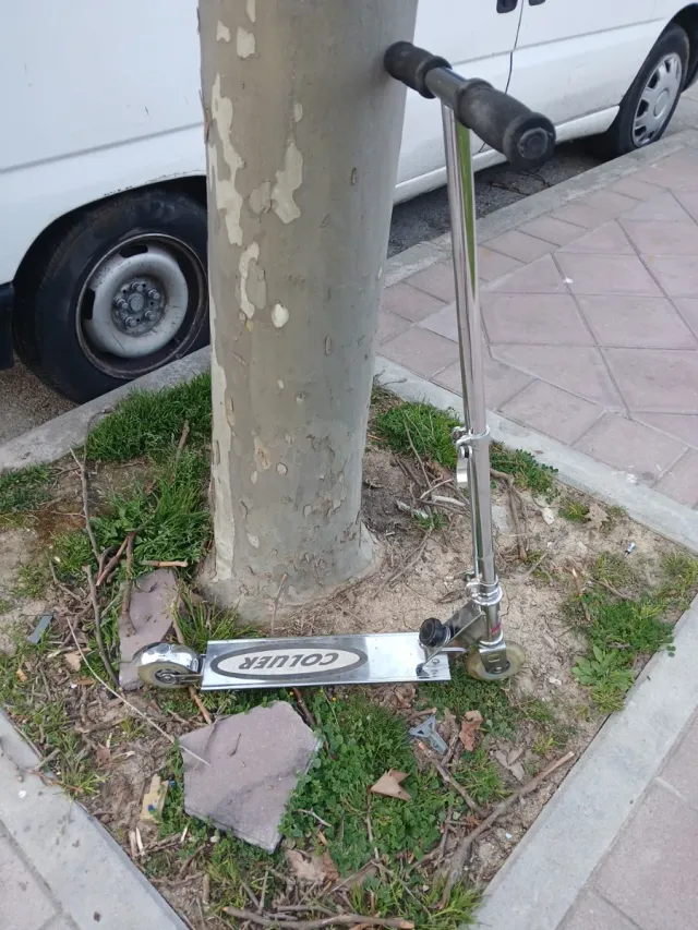 Patinete de estilo clásico con acabado plateado. - Plataforma con logo. - Ruedas y manillar negros.