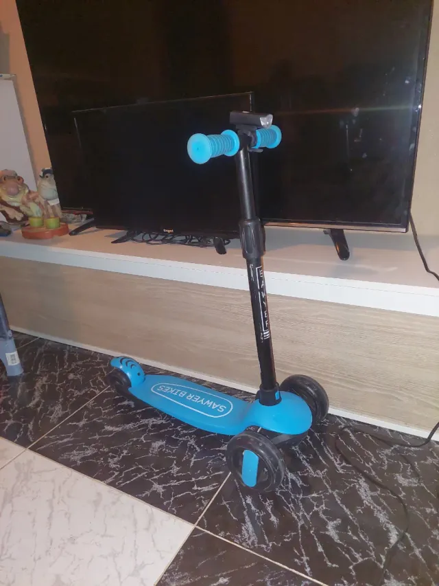 Detalles del productoPatinete infantil de tres ruedas en color azul, marca Sawyer Bikes. Ideal para los más pequeños.