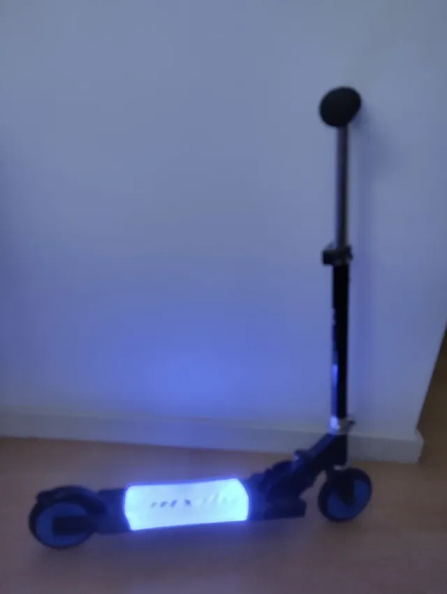 Patinete con un diseño moderno y llamativo, perfecto para desplazarse con estilo. - Plataforma con luces LED. - Ruedas de color azul. - Manillar ajustable.