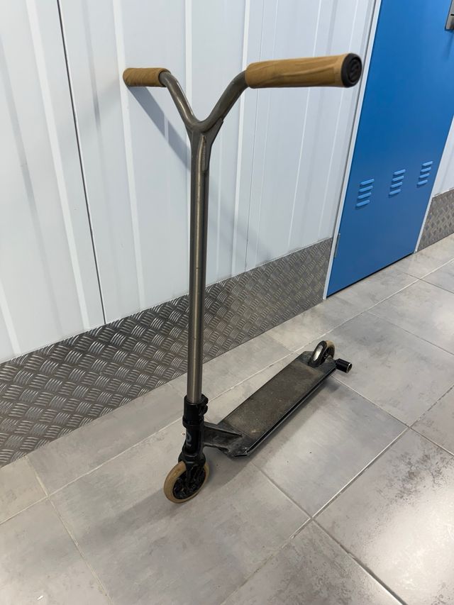 Patinete con signos de uso, pero en buen estado general. - Manillar con puños de color marrón. - Ruedas de color claro.