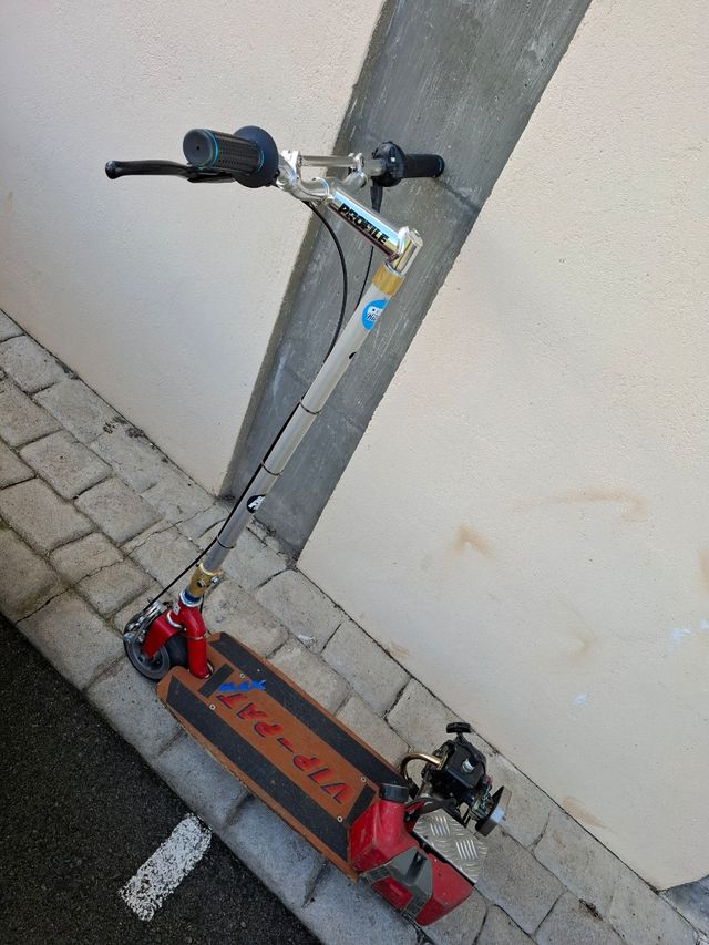 Patinete de gasolina con un diseño robusto y llamativo. - Plataforma de madera. - Ruedas de goma. - Manillar ajustable.