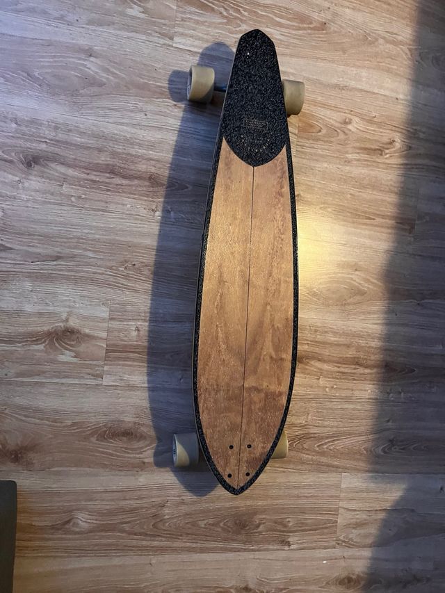 Patinete con diseño de madera y lija en la parte superior. - Diseño alargado y estrecho. - Ruedas de color claro.