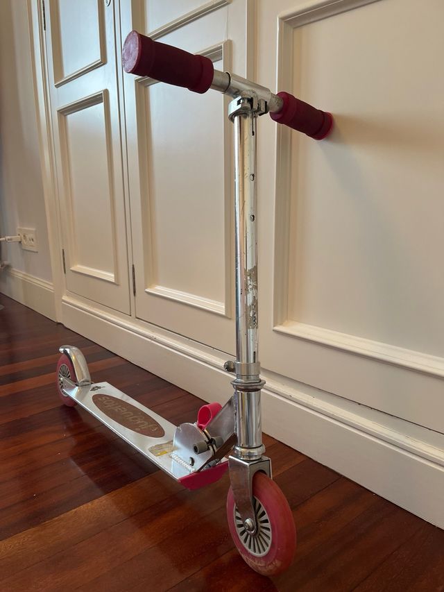 Patinete marca jugetos para niños, desgastado pero funcional.