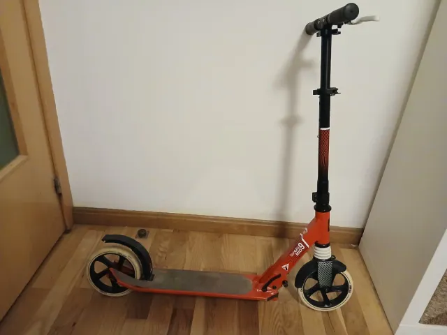 Detalles del productoPatinete urbano de paseo mqrca Oxelo (Decathlon), plegable con freno de mano y pie.