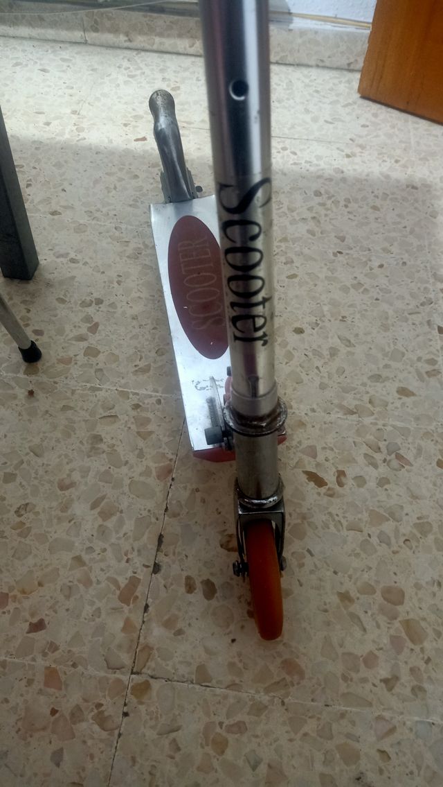 Patinete de pie con diseño plateado. - Manillar con agarres. - Rueda delantera naranja. - Plataforma para apoyar los pies.la marca es..scooter