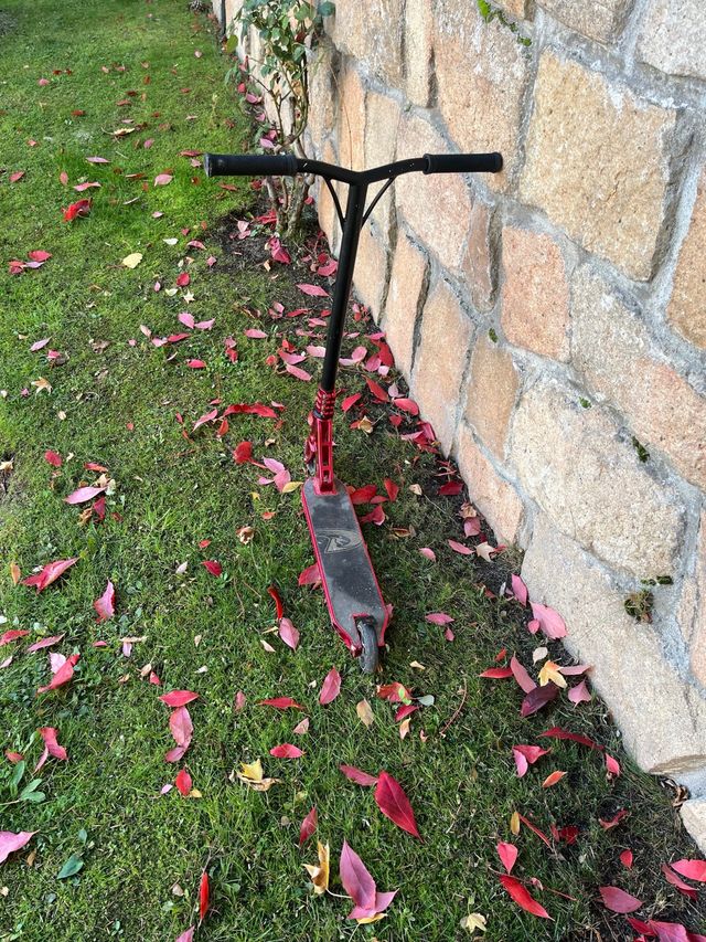Patinete diseñado para la práctica de trucos. - Manillar negro. - Base y horquilla en color rojo. - Ruedas negras.
