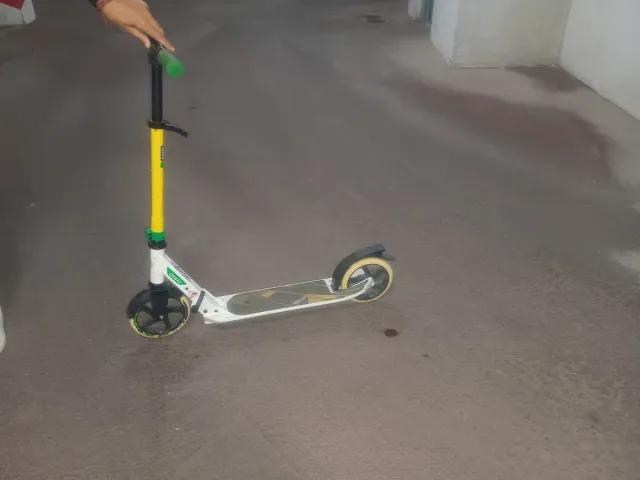 Patinete, ideal para desplazamientos urbanos. Su diseño es moderno y funcional. - Color blanco y amarillo. - Ruedas con banda de color. - Puños verdes.