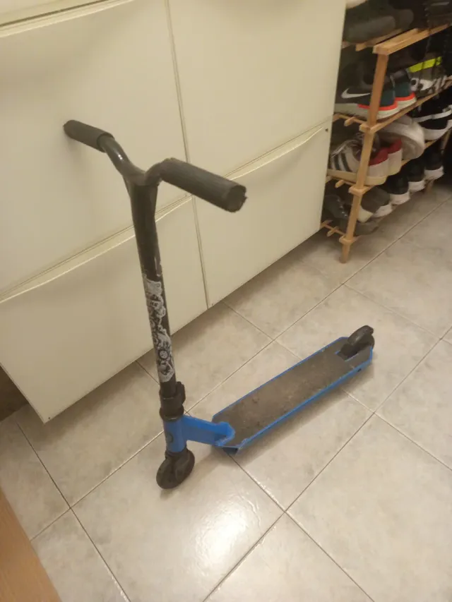 Patinete de estilo libre en color azul y negro. Ideal para trucos y desplazamientos. - Manillar negro con puños grises. - Plataforma azul. - Ruedas negras.