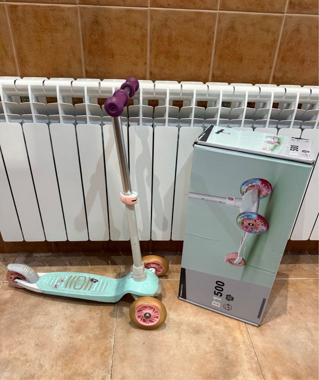 Patinete infantil de tres ruedas Decathlon B1 500. - Color menta y morado. - Ruedas con luces. - Manillar ajustable.
