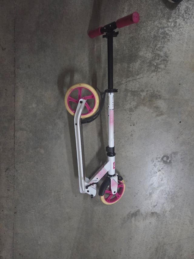 Patinete plegable de Decathlon en color blanco con detalles en rosa. - Ruedas de color rosa y amarillo. - Manillar ajustable.